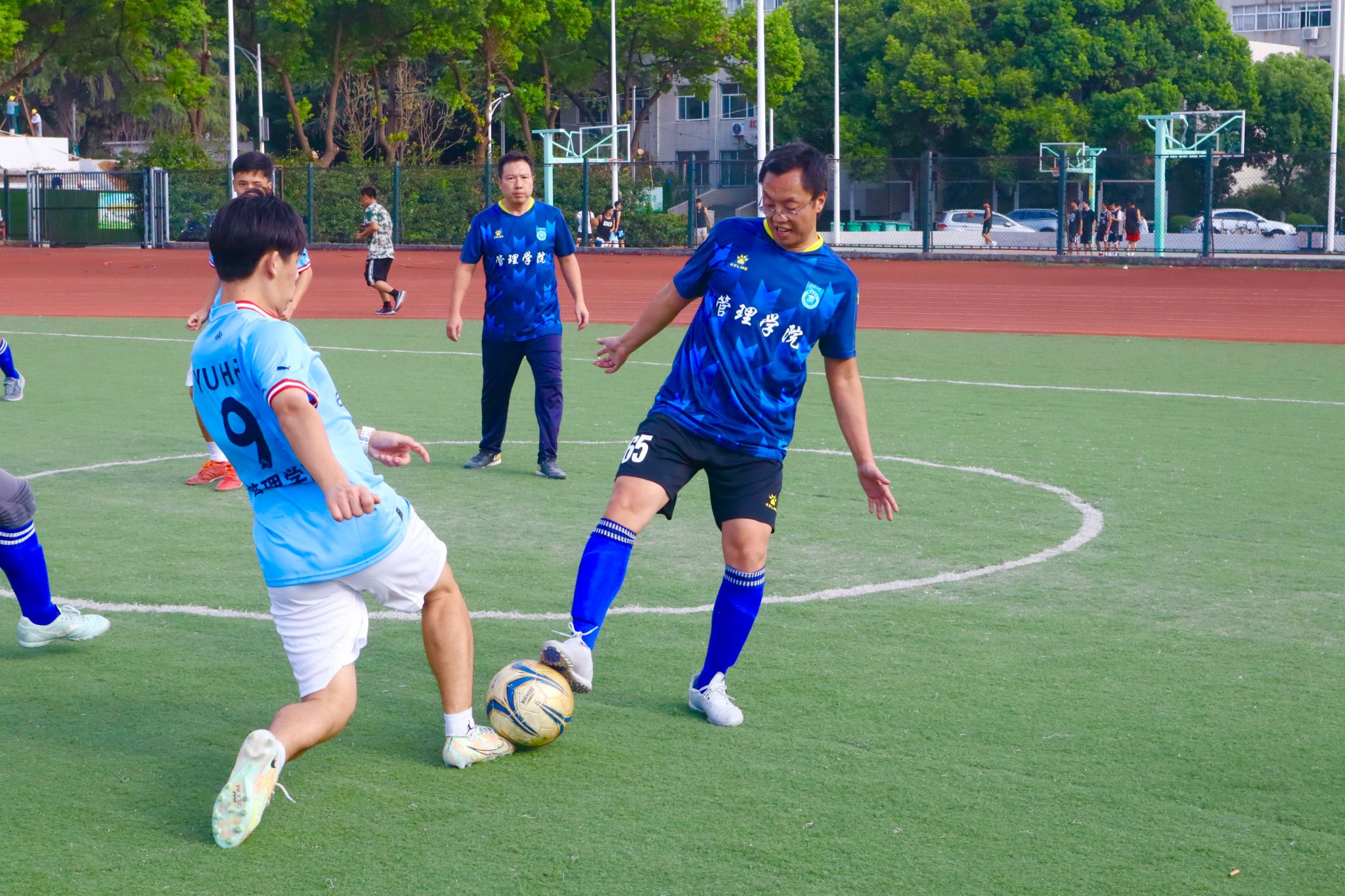 比赛过程中,师生双方战况激烈、势均力敌。场外老师和同学们也不断给球员们鼓励与欢呼,现场气氛热烈。最终,秉持着“友谊第一,比赛第二”的原则,经过一个多小时的角逐,学生队以4:3险胜教师队。比赛结束后,师生一起在绿茵场上合影留念。
